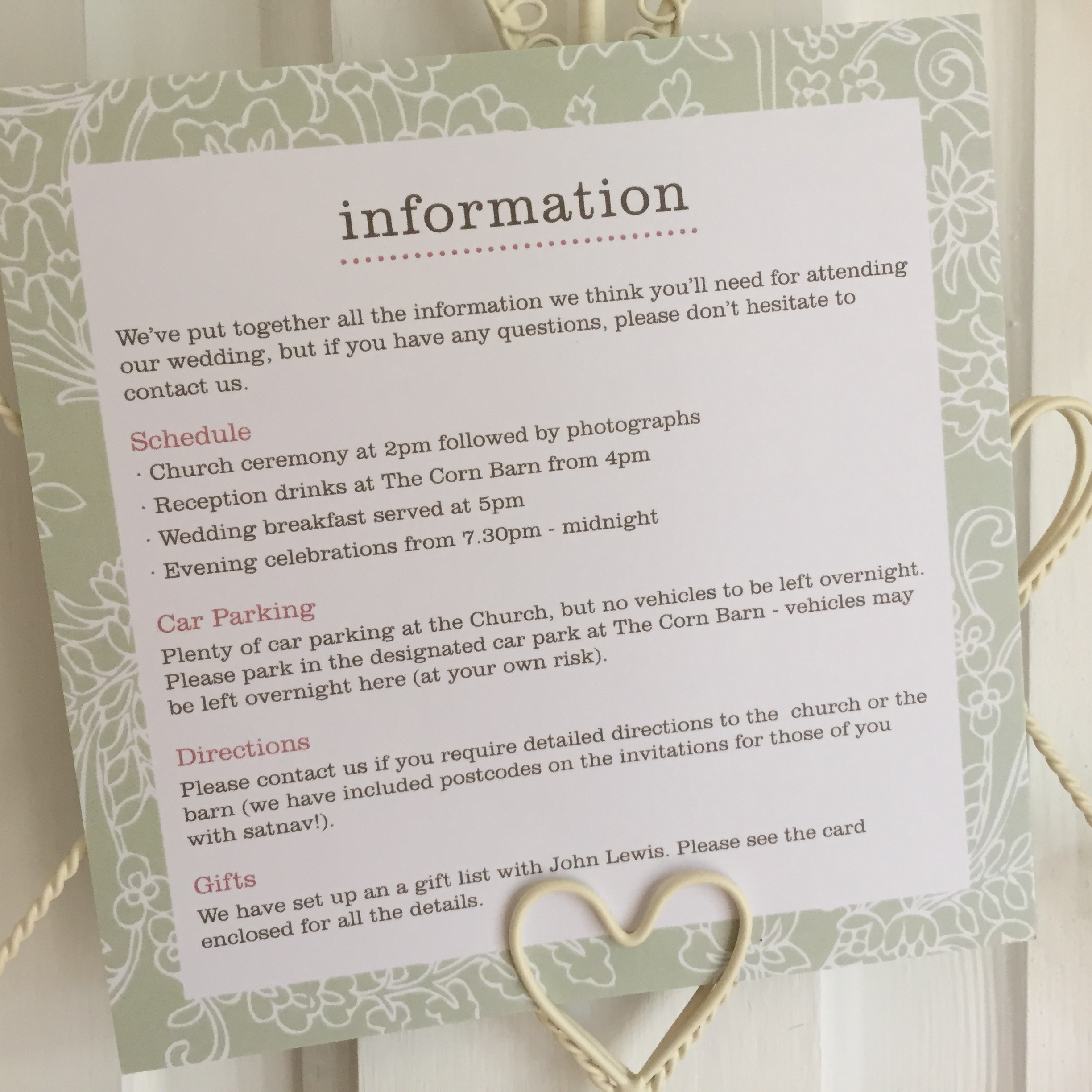 Use these cards to send out all the extra details that your guests may need to know – suitable for gift lists, directions, menus and any other general information. Just send us the wording and details you want to include and we’ll lay it all out for you.
